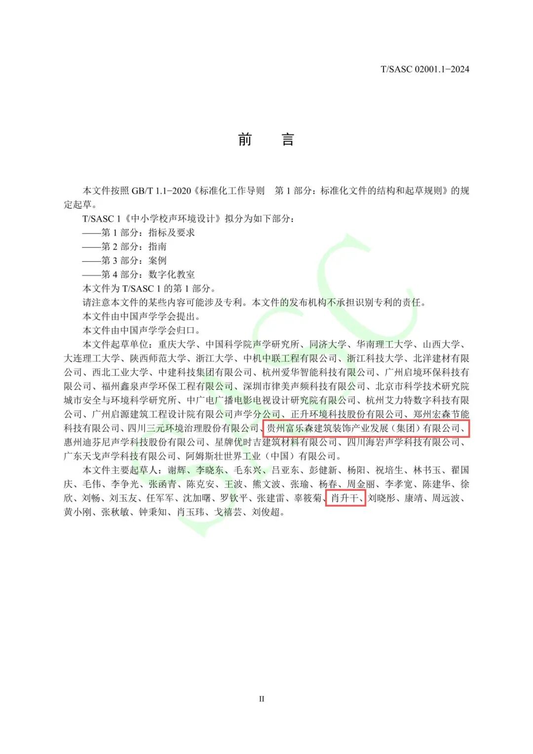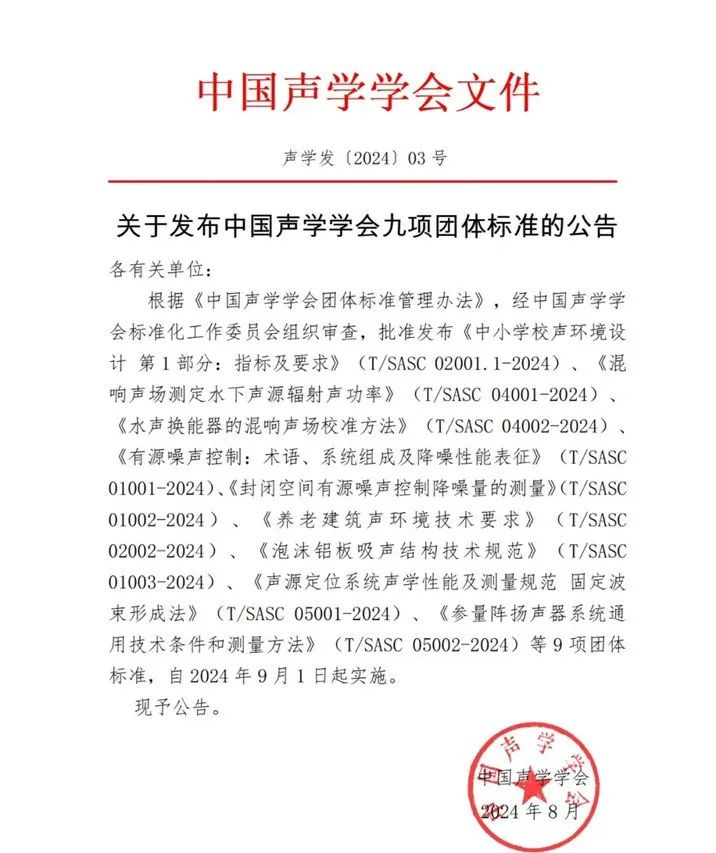 近日,中国声学学会标准化工作委员会发布中国声学学会九项团体标准,富乐森参与制定的团体标准《中小学校声环境设计 第1部分:指标及要求》(T/SASC 02001.1-2024)自2024年9月1日起正式实施。