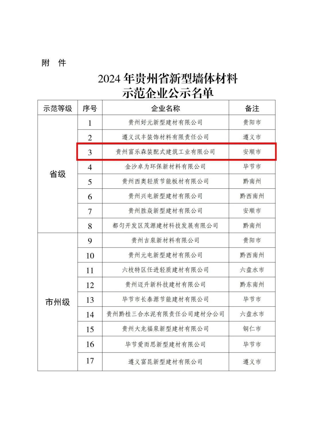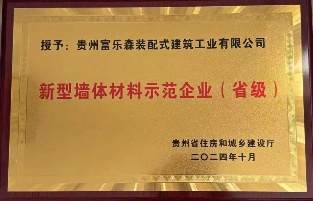 近日,贵州省住房和城乡住建厅发布《关于2024年贵州省新型墙体材料示范企业的公示》,贵州富乐森装配式建筑工业有限公司(以下简称”富乐森")获得“2024年贵州省新型墙体材料示范企业”荣誉称号。