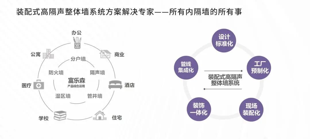 富乐森在发展过程中,结合市场需求,不断推进新技术的研发和应用,提供产品的技术含量及竞争力。以先进的装配式技术,为医疗、学校、酒店、办公、住宅、工业等室内空间提供隔墙系统解决方案,以隔声、防火、轻质、集成管线、结构灵活、节能环保、装饰一体等特点,赢得了各界全方面认可。