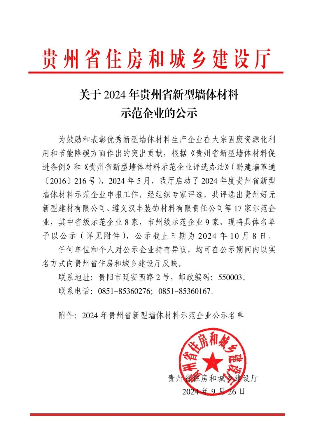 《关于2024年贵州省新型墙体材料示范企业的公示》