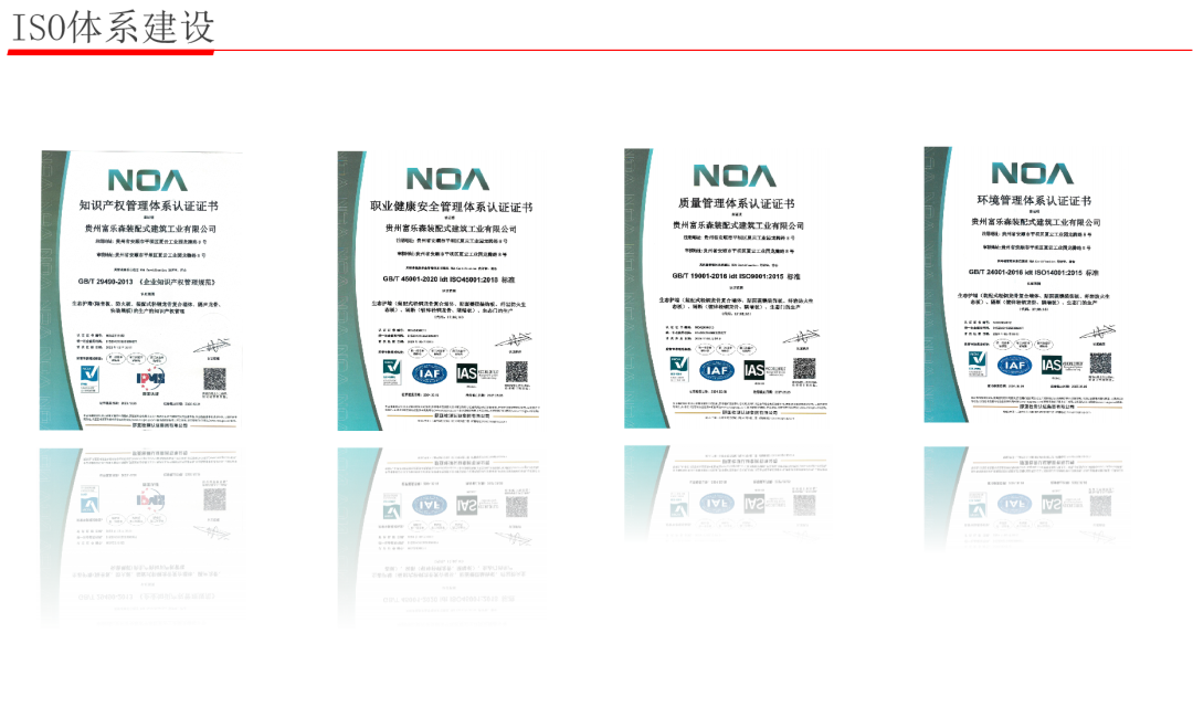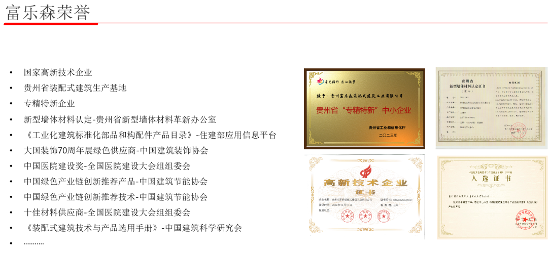 近年来,富乐森先后通过了质量管理体系、环境管理体系、职业健康安全管理体系及知识产权管理体系认证,已具有较高的生产管理水平和质量控制能力。同时,公司也荣获了“专精特新企业”、“国家高新技术企业”、贵州省装配式建筑生产基地等多项认证。自主研发的产品“装配式高隔声集成墙体系统”获得贵州省新型墙体材料认定、入选《装配式建筑技术与产品选用手册》、绿色产业链创新推荐技术及云南省装配式部品部件推广目录等多项荣誉。
