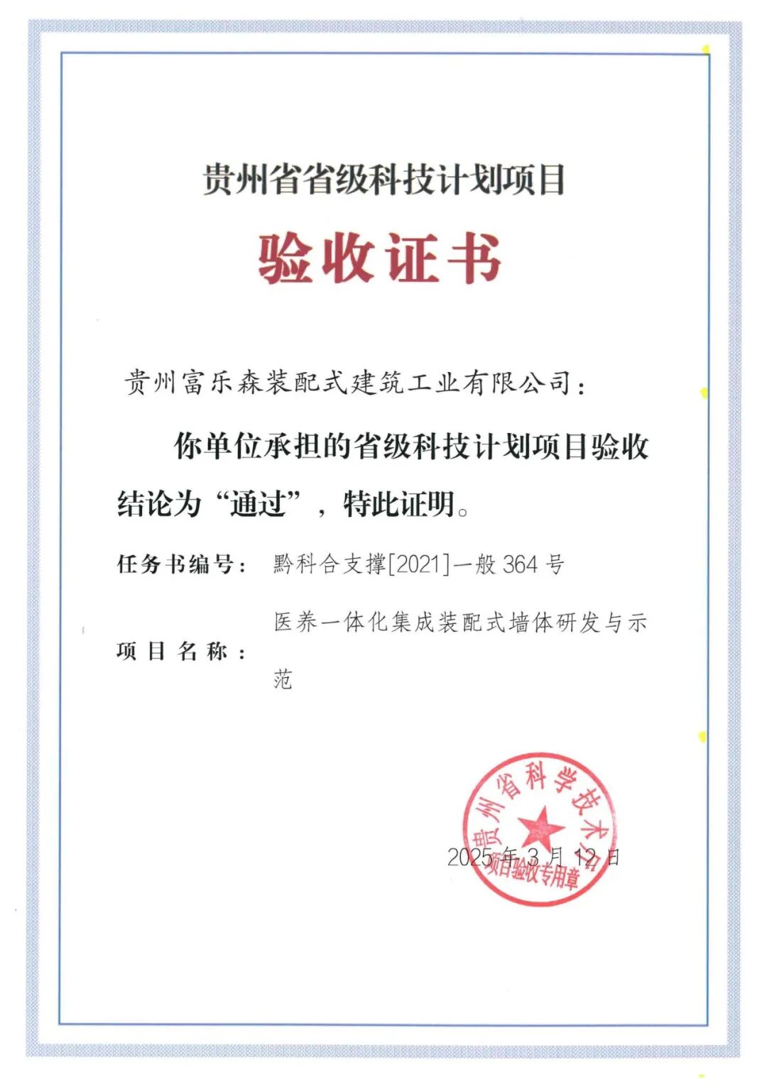 近日,2025年贵州省省级科技计划项目验收结果正式公布。由贵州富乐森装配式建筑工业有限公司(以下简称“富乐森”)牵头承担的省级科技计划项目《医养一体化集成装配式墙体研发与示范》课题,顺利通过贵州省科技厅组织的结题验收评审,并成功获得“贵州省省级科技计划项目验收证书”!这标志着富乐森在装配式建筑核心技术领域取得又一重大突破。