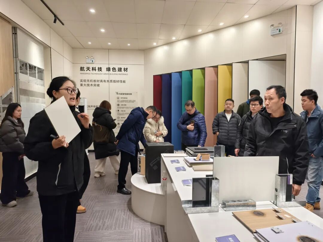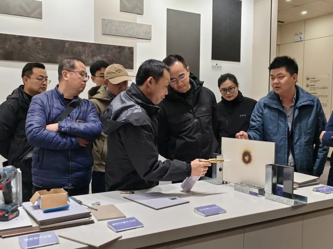 董明会长一行先后参观了富乐森工艺展厅及装配式生产基地,现场观摩了产品隔声、防火、握钉力、拧螺丝次数、吊挂力等关键性能实测,通过实物展示、情景模拟与深入的技术讲解,全面了解了富乐森在装配式建筑领域的创新成果与技术实力。